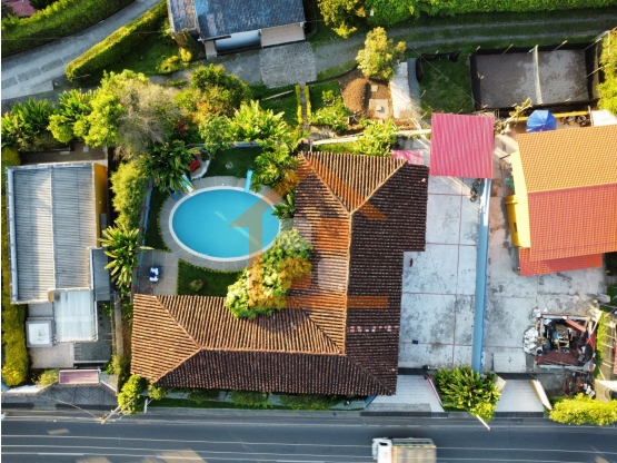 Cuenta con 7 alcobas, 2 baños completos y 1 baño auxiliar. Su diseño tipo casa tradicional antioqueña ofrece amplios corredores que brindan frescura y comodidad. Los pisos son en madera en las alcobas y en material mineral en los corredores. Dispone de servicios públicos: agua (EPA), energía (EDEQ) y gas. El lote es totalmente plano y la propiedad incluye piscina, además de parqueadero con capacidad para 6 vehículos.